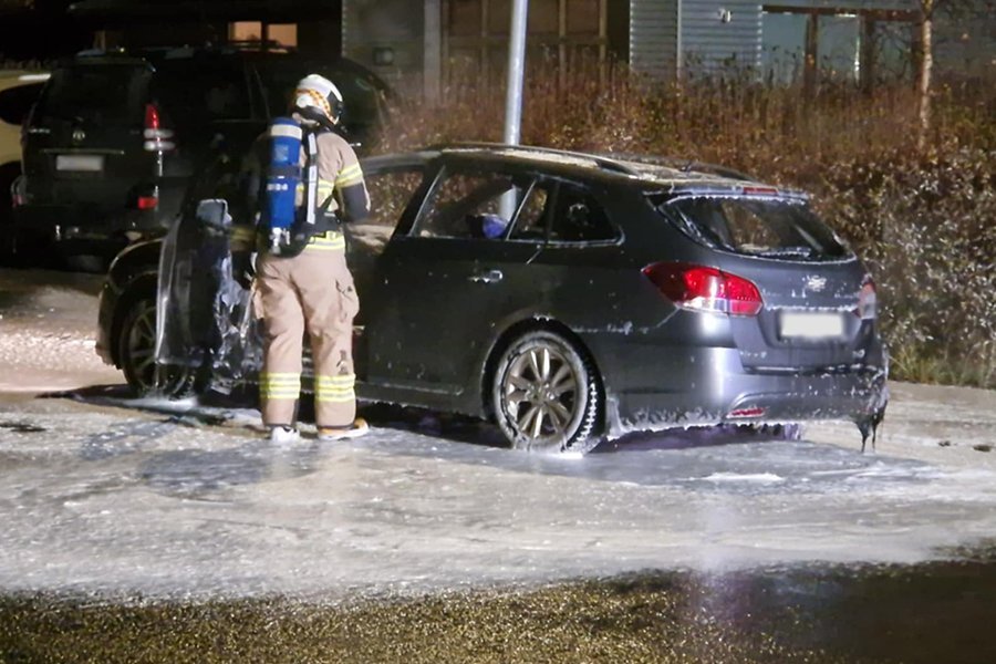 Slökkviliðsmenn að störfum við bílinn sem kveikt var í við Bjarkarlund á laugardagskvöldið. Mynd: Valur Sæmundsson
