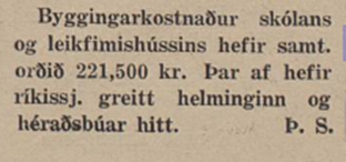 Í Tímanum 22. apríl 1936 er greinarstubbur merktur ÞS (væntanlega Þórólfur Sigurðsson í Baldursheimi) þar sem tiltekið er að á 10 ára tímabili hafi kostnaður við skólaframkvæmdir – með íþróttahúsi og rafstöð ) samtals numið kr. 221.500 og hafi ríkið greitt helminginn en héraðsbúar hitt. Fyrstu byggingar 1924 til 1925 voru hins vegar kostaðar að lágmarki 60% af heimamönnum með vinnu og gjafafé. Ekki er fullljóst hvort gjafavinna félagsmanna í ungmennafélögunum er að fullu virt til verðs í þessum tölum.