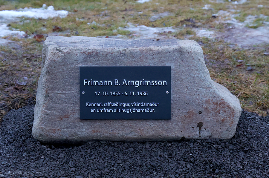 „Kennari, raffræðingur, vísindamaður en umfram allt hugsjónamaður,“ stendur á legsteini Frímanns B. Arngrímssonar í gamla kirkjugarðinum uppi á höfðanum á Akureyri.