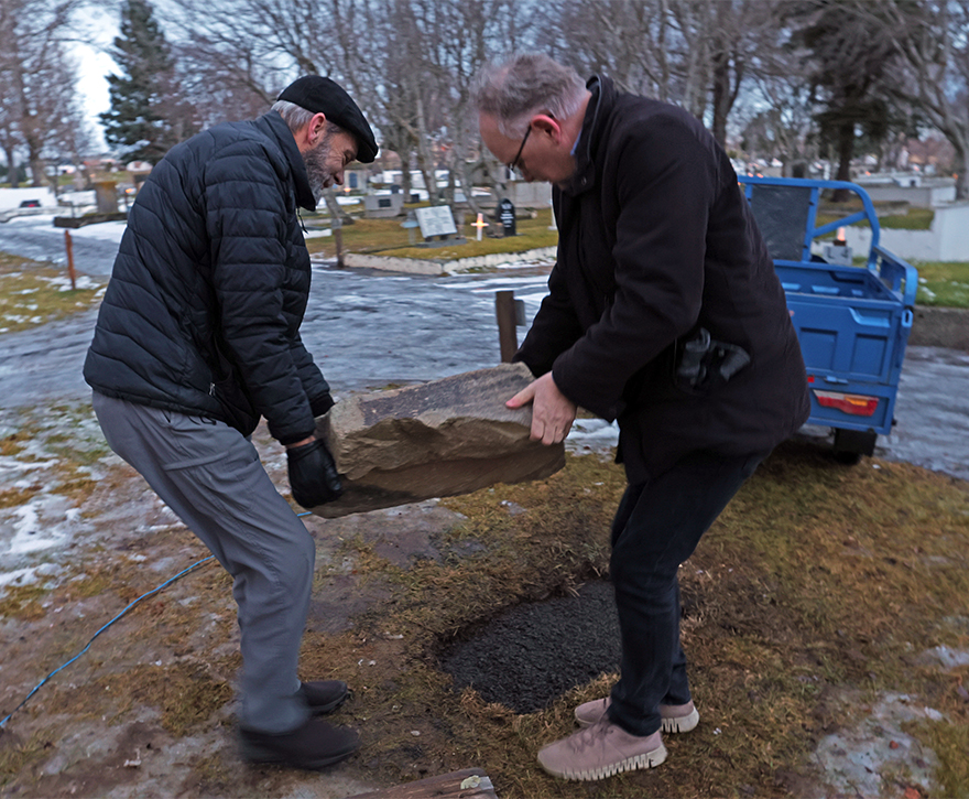 Valdimar Gunnarsson, höfundur bókarinnar um Frímann, og útgefandinn, Helgi Jónsson, koma legsteininum fyrir.