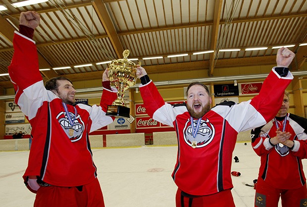 Ingvar Þór Jónsson og Björn Már Jakobsson lyfta Íslandsbikarnum 2016. Björn Már er hættur á skautunum, en er annar aðstoðarþjálfara liðsins. Ingvar Þór er snúinn aftur á svellið eftir að hafa lagt skautana á hilluna. Mynd: Skapti Hallgrímsson.