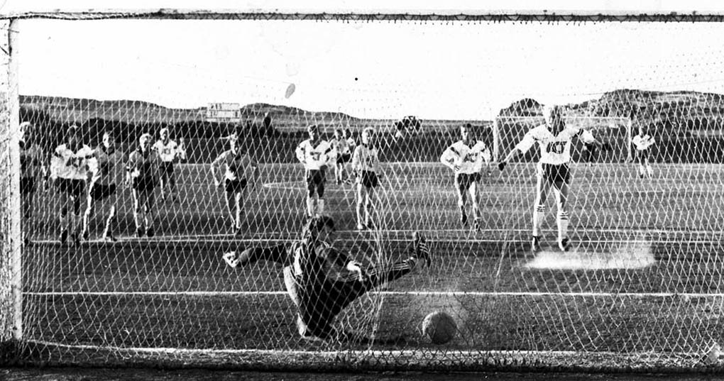 Jónas Róbertsson skorar úr vítaspyrnu fyrir Þór í 2:0 sigri á Íslandsmeisturum Akraness um miðjan maí árið 1985. Leikið var á malarvelli Þórs, á svæðinu þar sem nýlega var lagt gervigras.