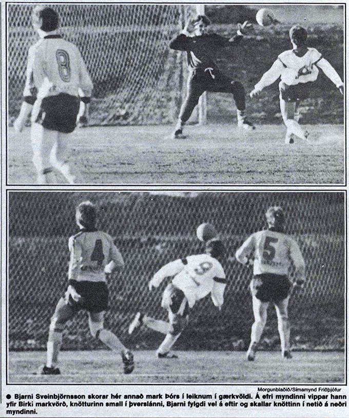 Úrklippa úr Morgunblaðinu – Bjarni Sveinbjörnsson skorar þarna seinna mark Þórs í sigrinum á ÍA í maí 1985.