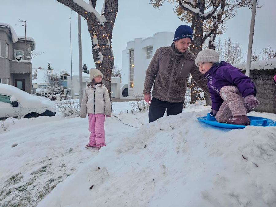 Í ljós kemur að Hrafnkell er vanur að fagna snjónum með listfengi. „Við gerum alltaf eitthvað þegar fyrsti snjórinn kemur; snjóhús, kanínur, ljón eða rennibrautir. Þetta verður alltaf betra og betra með hverju ári hjá okkur,“ segir Hrafnkell en í ljós kemur að hann er myndlistarmaður og sköpun því hans ær og kýr. „Ég vinn við fasteignaumsjón hjá Skálabrekku en er líka í myndlistinni,“ útskýrir hann en þess má geta að um þessar mundir er hann að sýna verk sín í Sparisjóði Höfðhverfinga við Glerárgötu. Aðspurður hvort honum finnist allur þessi snjór vera of mikið af því góða segir hann að hann vilji frekar alvöru vetur heldur en eitthvað hálfkák. „Það er best að snjórinn komi bara allur í einu, frekar en fimm haustlægðir og smá hret.“