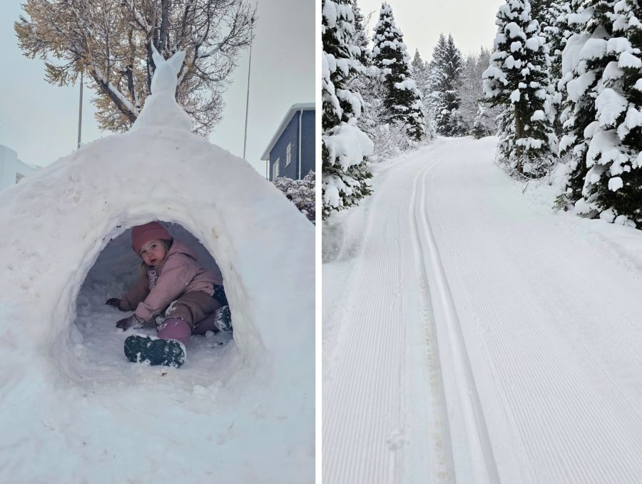 Miklum snjó hefur kyngt niður á Akureyri undanfarna daga og bærinn breyst í sannkallað vetrarríki. Þetta hefur glatt bæði yngstu kynslóðina og skíðafólk en gönguskíðabrautir í Kjarnaskógi voru opnaðar um helgina.