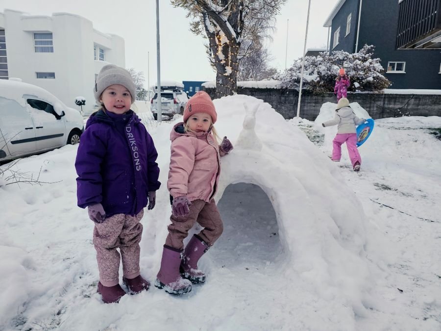 Snjórinn hefur sannarlega glatt yngstu kynslóðina sem hefur verið dugleg að fara út að leika en víða má sjá snjólistaverk í görðum. Á horni Hamarstígs og Helgamagrastrætis er t.d. að finna glæsilegt snjóhús og rennibraut sem Hrafnkell Elvarsson reisti um helgina ásamt dætrum sínum Móeyju, 5 ára, og Ylfu, 3 ára. „Það var bara rokið út um leið og snjórinn kom,“ segir Hrafnkell og hlær. „Stelpurnar vildu ekki bíða neitt. Það var mokað í skafl og hola grafin inn. En svo var snjórinn líka það blautur í byrjun að það var hægt að móta þetta til og búa til skúlptúra,“ segir Hrafnkell og vísar þar í vel mótaða kanínu sem trónir yfir innganginum í snjóhúsið.