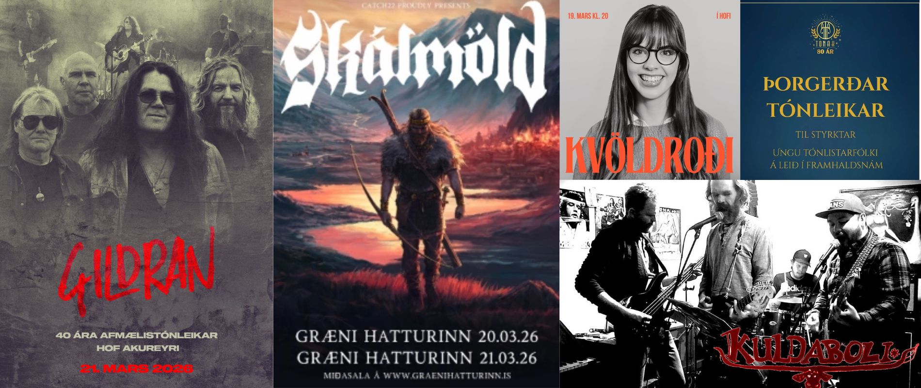 Fjölbreyttir tónleikar eru í boði þessa vikuna, en Gildran heldur 40 ára afmælistónleika í Hofi, Skálmöld hristir hattinn, Eik Haralds og stórsveit flytja frumsamda djasstónlist í Blackbox í Hofi, Kuldaboli, nýtt band úr hugarfylgsnum Kristnesbræðranna Helga og Begga ásamt fleirum, kemur fram á Leyni o.fl.