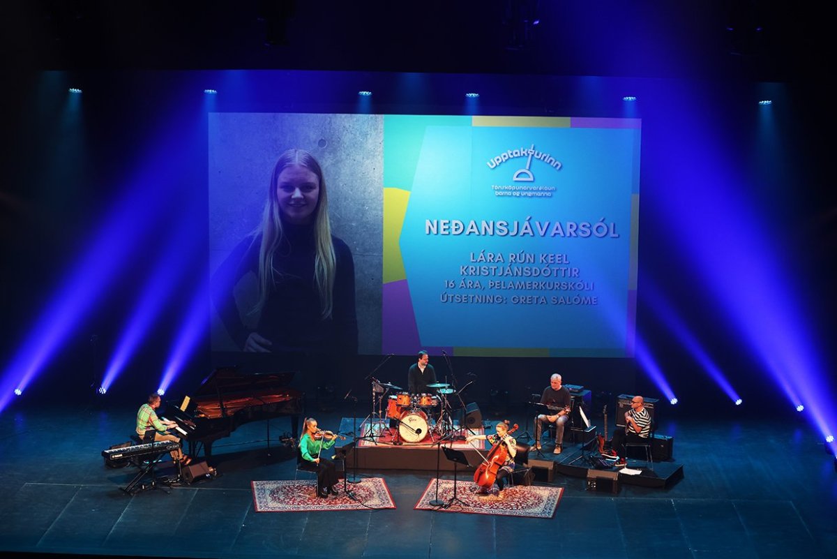 Frá tónleikum Upptaktsins í fyrra. Atvinnutónlistarmenn aðstoða ungu tónskáldin við að útsetja og flytja lögin þeirra á stórtónleikum í Hamraborg í Hofi. Mynd: Þorgeir Baldursson