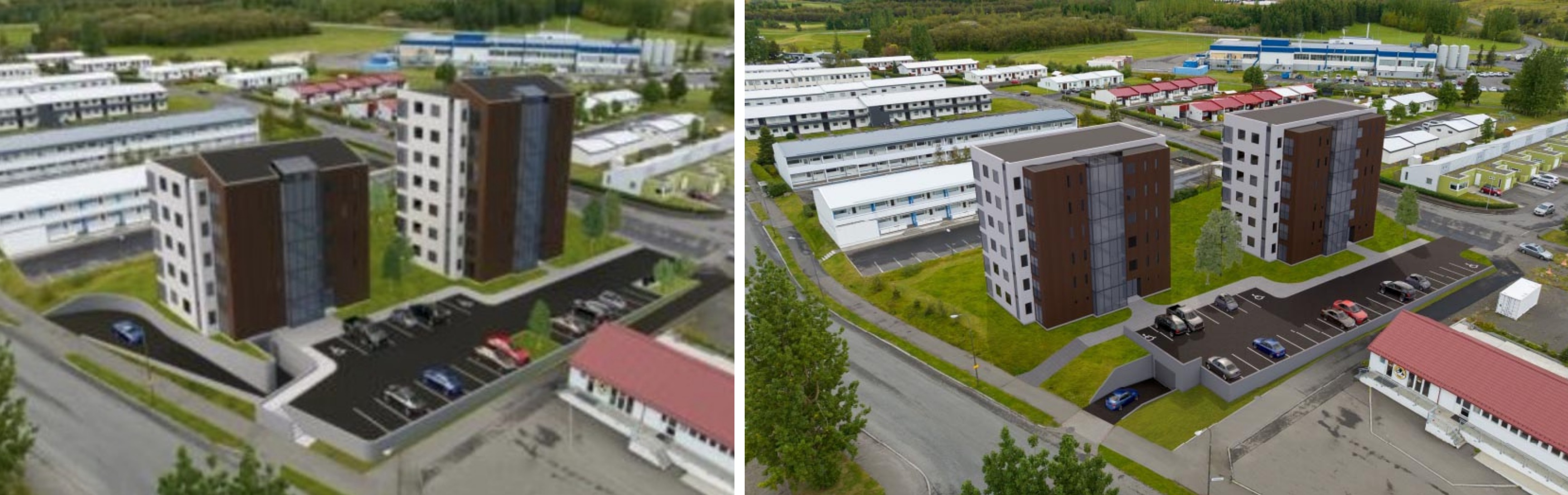 Myndir úr nýjustu tillögunni að breyttu deiliskipulagi. Á myndinni til vinstri er horft til suðurs, en á myndinni til hægri er horft úr Hrísalundi til vesturs. Eins og sjá má er gert ráð fyrir aðkomu á bílastæði og í bílakjallara úr Skógarlundinum, gegnt Hrísalundi. Skjáskot úr skipulagsgögnum.