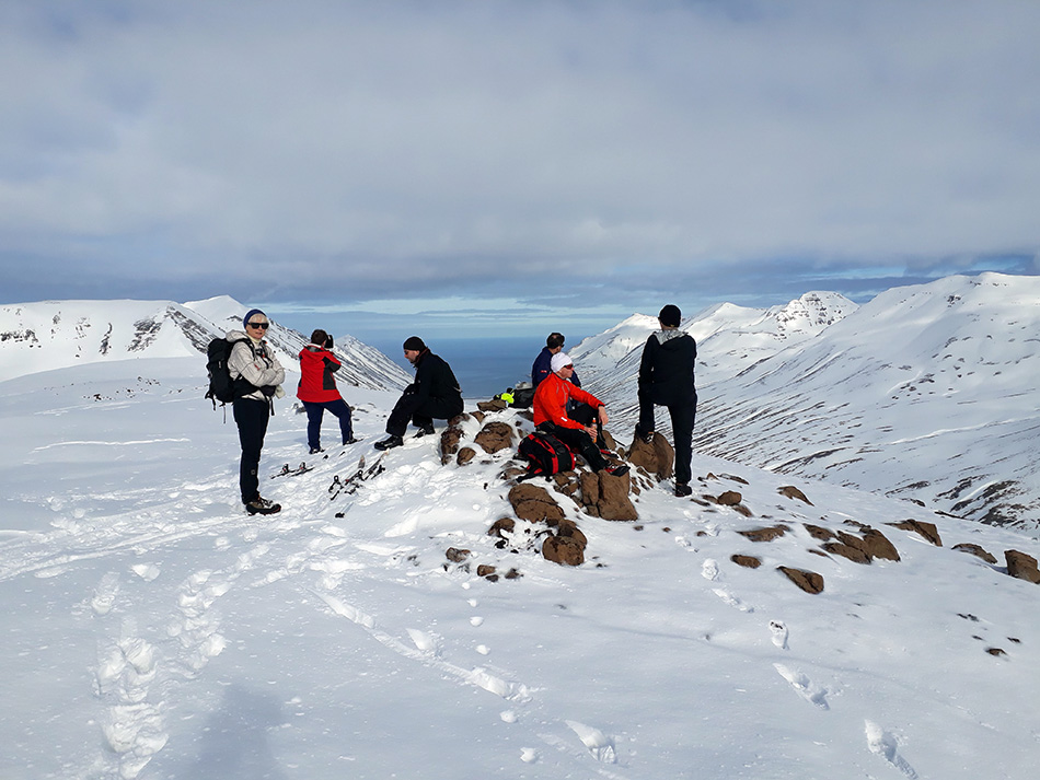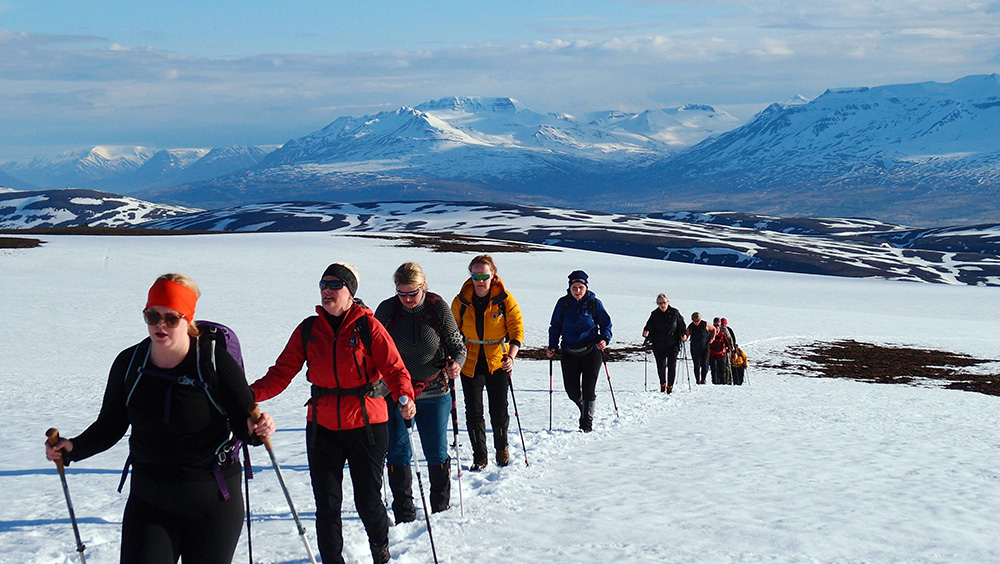 Skíðagönguhópur á svokallaðri Botnaleið milli Ólafsfjarðar og Siglufjarðar. Héðinsfjörður fyrir miðri mynd.