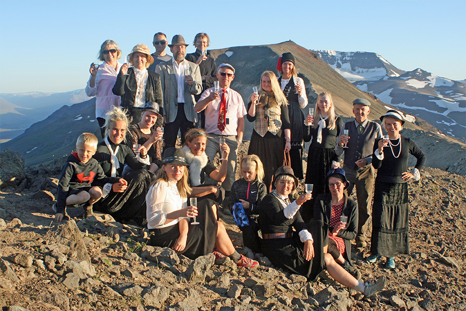 Prúðbúið göngufólk á tindi Ytri-Súlu. Syðri-Súla og Kerling í baksýn. Mynd: Ingvar Teitsson