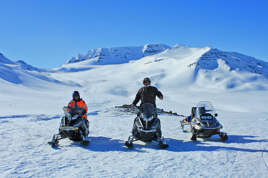 Í vélsleðaferð á Glerárdal. Kerling (t.v.) og Lambárdalsöxl í baksýn. Mynd: Ingvar Teitsson