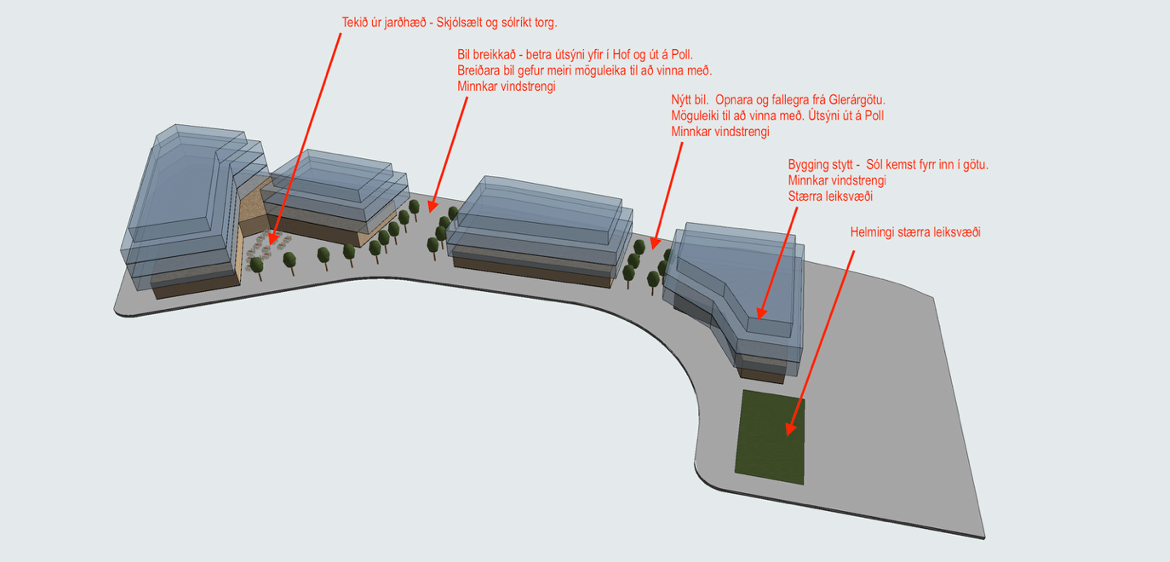 - Nokkur breyting er á lagi jarðhæðar. Helsta breytingin er að fallið er frá þakgarði á 2. hæð Hofsbótar 1 og hann færður niður og breytt í sólríkt og skjólgott torg, opið öllum almenningi og án efa kærkominn griðastaður fyrir íbúa og gesti miðbæjarins.