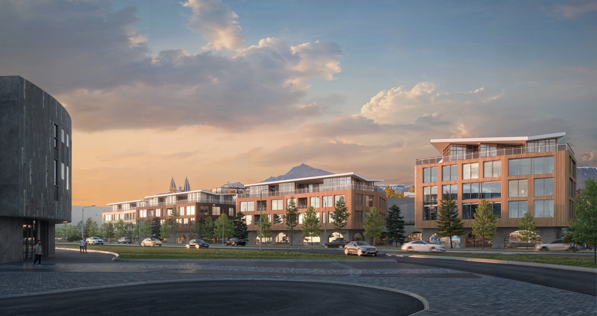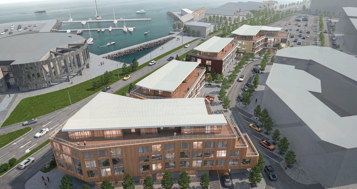 Hugmynd að útliti fyrirhugaðra bygginga séð frá menningarhúsinu Hofi.