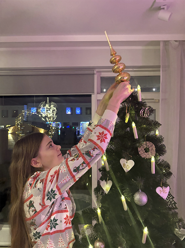 Í fjölskyldunni minni erum við með fullt af jólahefðum. Við bökum og skreytum myndakökur með allri mömmu fjölskyldu, förum í jólahúsið og fáum karmelluepli, fáum glæný jólanáttföt 1. nóvember, borðum möndlugraut heima hjá báðum ömmum mínum og öfum, skreytum jólatréð og svo er það auðvitað allur jólamaturinn. Við borðum alltaf kalkún á aðfangadag sem pabbi sér um að elda en ég og mamma búum til rjómasalatið saman. Okkur finnst reyndar skemmtilegast að smakka það til því við elskum rjóma.