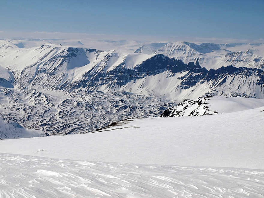 Yfirsýn niður til Hraundranga og fjallanna þar í kring séð frá Landafjalli, eftir að hafa skotist þangað á vélsleða frá Lamba vorið 2008. Sjónarhornið er til marks um hæð fjalla Tröllaskagans umhverfis Glerárdal. Mynd Hjalti Jóhannesson.