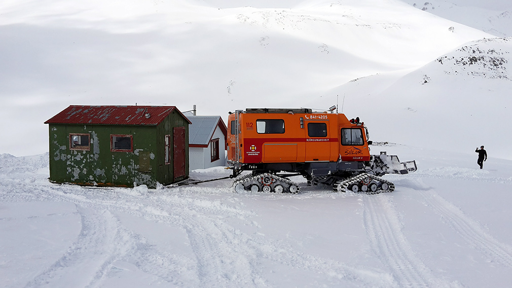 Tucker snjóbíll Súlna, björgunarsveitarinnar á Akureyri dregur gamla Lamba aftur til byggða vorið 2016. Nýi Lambi sést í bakgrunni. Mynd Hjalti Jóhannesson.