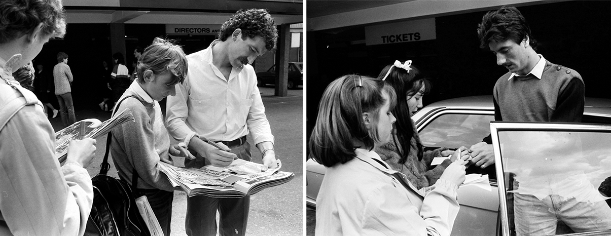 MAÍ 1984 – „Mottumennirnir“ Graeme Souness fyrirliði Liverpool og markamaskínan Ian Rush gefa stuðningsmönnum liðsins eiginhandaráritun fyrir utan Anfield, heimavöll félagsins. Myndir: Skapti Hallgrímsson