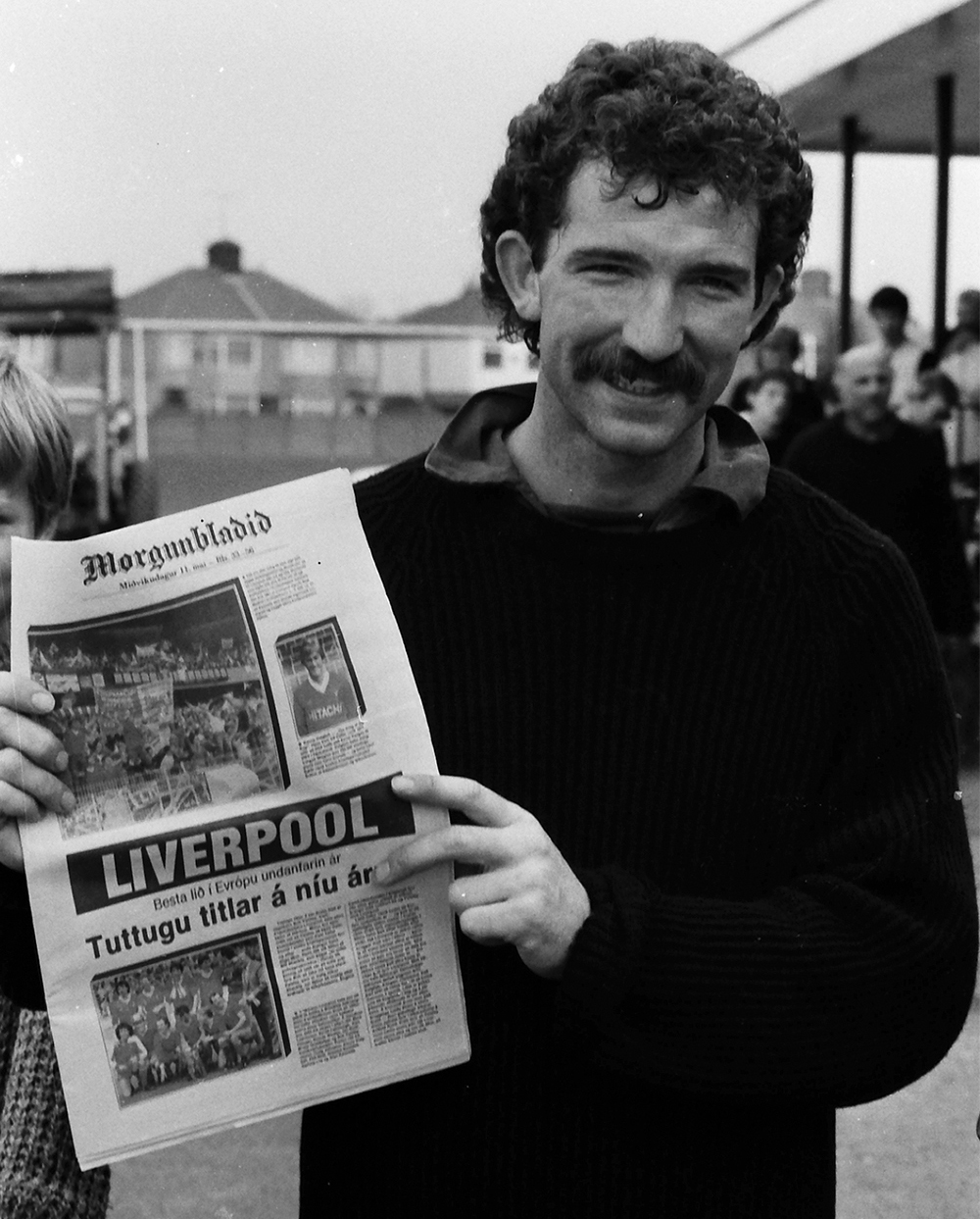 MAÍ 1984 – Graeme Souness, fyrirliði Liverpool, með eintak af Morgunblaðinu á Melwood, æfingavelli Liverpool. Síðar í sama mánuði hampaði hann Evrópubikarnum eftir að Liverpool sigraði í Evrópukeppni meistaraliða, sem nú kallast Meistaradeild Evrópu. Mynd: Skapti Hallgrímsson