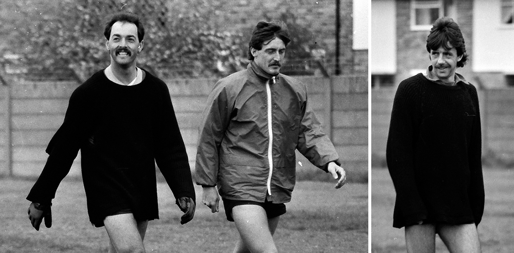 MAÍ 1984 – Bruce Grobbelaar, David Hodgson og Mark Lawrenson á æfingu með Liverpool á Melwood. Grobbelaar og Lawrenson lykilmenn í liðinu en Hodgson jafnan varaskeifa. Allir skörtuðu forláta yfirvaraskeggi. Myndir: Skapti Hallgrímsson