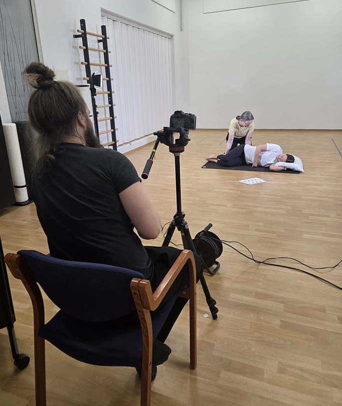 Unnið við að taka upp myndband af æfingum.