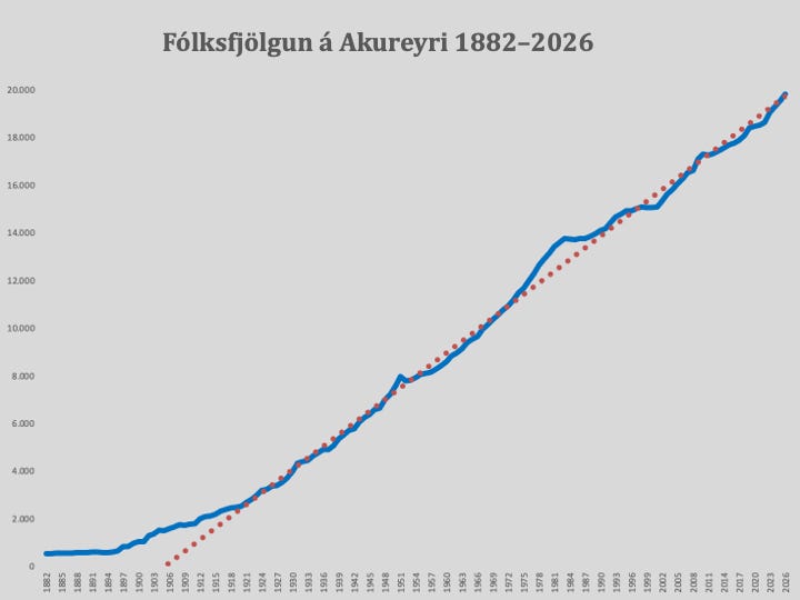 Þessi línulegi vöxtur þýðir jafnframt að hlutfallsleg fjölgun Akureyringa hefur farið minnkandi yfir tíma. Árið 1920 samsvöruðu 163 nýir íbúar þannig 6,0% fólksfjölgun en árið 2026 aðeins 0,8% fólksfjölgun.