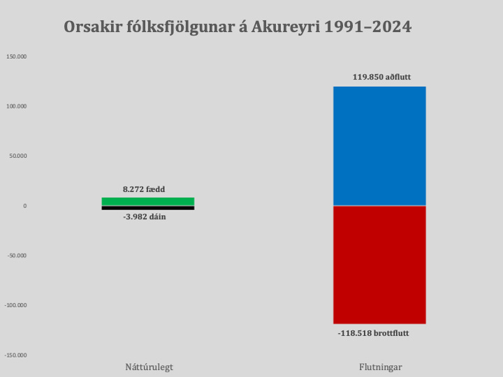 Engu að síður hafa náttúrlegir þættir mun meiri áhrif á mannfjöldaþróun Akureyrar en fólksflutningar. Á tímabilinu 1991-2024 var fjöldi aðfluttra til Akureyrar aðeins rúmlega þúsund fleiri en fjöldi brottfluttra, en fæðingar voru rúmlega fjögur þúsund fleiri en dauðsföll. Náttúruleg fjölgun skýrir því mannfjöldaþróun á Akureyri að stærstu leyti á þessu tímabili. Það skekkir myndina að ákveðnu marki að brottfluttir deyja eðli málsins samkvæmt annars staðar en hlutfallið milli fæðinga og dauðsfalla á Akureyri er engu að síður svipað landsmeðaltalinu.