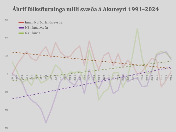 Til að setja þessar niðurstöður í samhengi hagnaðist Akureyri þannig á fimm ára tímabili 1991-1995 um 349 íbúa frá öðrum byggðarlögum á Norðurlandi eystra en tapaði 321 til höfuðborgarsvæðisins og annarra landshluta og tapaði 67 íbúum til útlanda. Flutningsjöfnuður Akureyrar á þessum fimm árum var því lítið eitt óhagstæður um 39 íbúa. Á fimm ára tímabili 2020-2024 hagnaðist Akureyri hins vegar aðeins um 67 íbúa frá öðrum byggðarlögum á Norðurlandi eystra en hagnaðist um 436 íbúa frá höfuðborgarsvæðinu og öðrum landshlutum og 444 íbúa frá öðrum löndum. Flutningsjöfnuður Akureyrar á þessum fimm árum var því hagstæður um 947 íbúa.