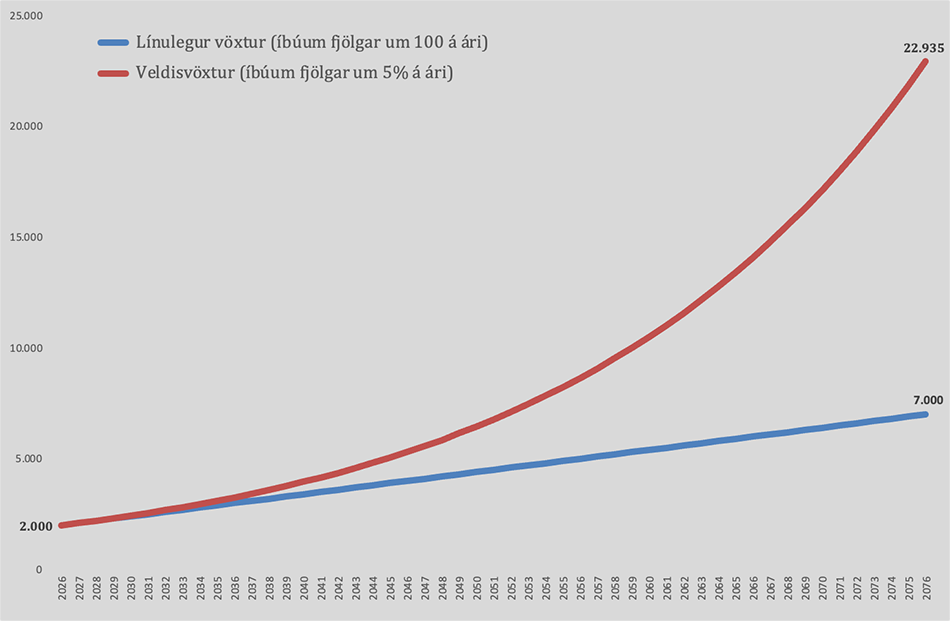 Það er hins vegar mikilvægt að átta sig á því á muninum á línulegum vexti og hlutfallslegum veldisvexti. Eins og sjá má af þessari mynd mætti ímynda sér bæjarfélag með 2000 íbúa árið 2026 þar sem íbúum fjölgaði um 100 íbúa eða 5% milli ára. Ef fjölgunin yrði stöðug um 100 íbúa á ári næstu 50 árin yrðu íbúarnir orðnir sjö þúsund árið 2076. Ef fjölgunin yrði hins vegar stöðug um 5% á ári yrði íbúarnir hins vegar næstum 23 þúsund talsins eftir fimmtíu ár.