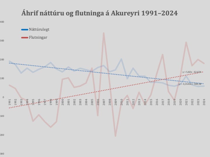 Eins og sjá má á næstu mynd hefur náttúrleg fjölgun farið minnkandi á Akureyri en á sama tíma hefur flutningsjöfnuður orðið jákvæðari frá 1991. Daufu óreglulegu línurnar sýna sveiflur milli ára en dökku beinu línurnar sýna þróunina. Nánar tiltekið minnkaði náttúrlega fjölgunin um 3,3 íbúa á ári á þessu tímabili en flutningsjöfnuður batnaði um 5,8 íbúa á ári. Frá árinu 2018 er flutningsjöfnuðurinn að jafnaði orðinn mikilvægari en náttúrulegir þættirnir og haldi svo fram sem horfir munu vaxandi aðflutningar umfram brottflutninga leiða til hraðari fjölgunar en 163 íbúa á ári.