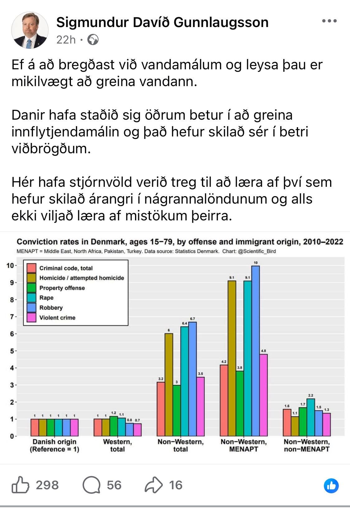 Hvað segir þessi mynd okkur? Segir hún okkur eitthvað um glæpatíðni þessara hópa? Nei, það gerir hún ekki. Hún sýnir einfaldlega hlutfall sakfellinga, þar sem mismunandi hópar innflytjenda eru bornir saman við innfædda (ef ég skil myndina rétt). Í löndum sem búa við heilbrigt réttarkerfi þá er ekkert óeðlilegt við það að slíkt hlutfall sé hátt. Okkur finnst það til að mynda áhyggjuefni þegar sakfellingarhlutfall í kynferðisbrotamálum er lágt.