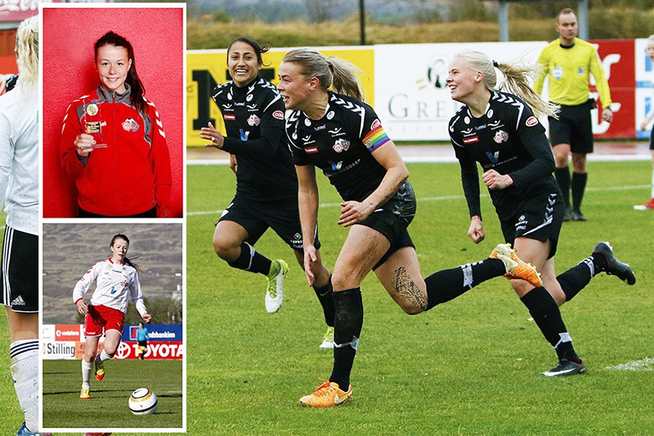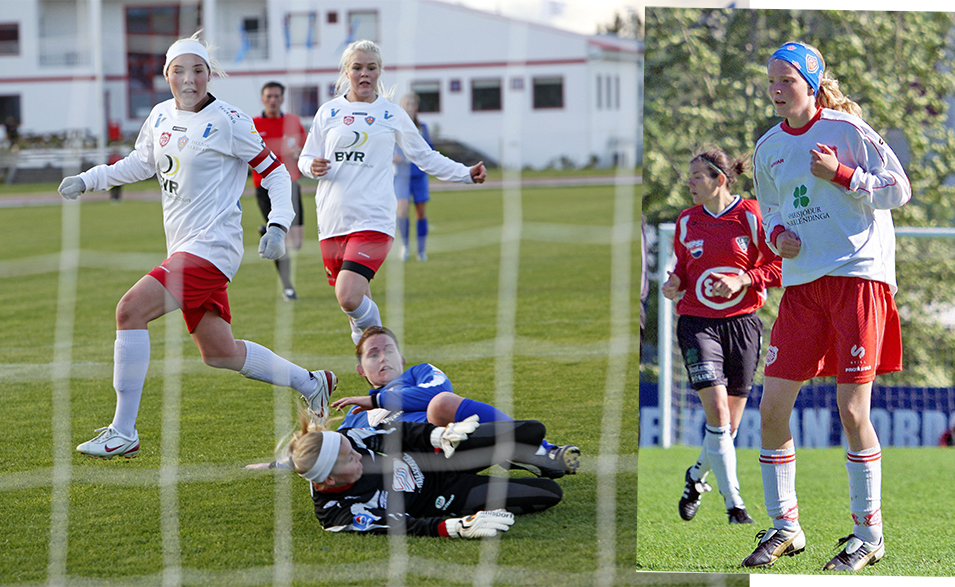 Akureyrsku konurnar þrjár sem eiga fleiri deildaleiki að baki en Sandra María. Á vinstri myndinni eru Rakel Hönnudóttir, til vinstri, og Arna Sif Ásgrímsdóttir í 7:0 sigri Þórs/KA á GRV á Þórsvellinum sumarið 2009. Rakel gerði tvö mörk í leiknum og Arna Sif eitt. Til hægri er Laufey Björnsdóttir í 1:1 jafntefli Þórs/KA/KS og ÍBV á Akureyrarvelli sumarið 2004. Laufey gerði mark Þórs/KA/KS þann dag. Myndir: Skapti Hallgrímsson